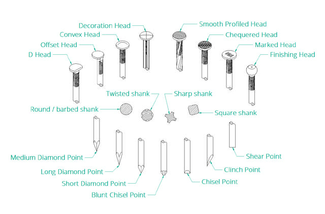 - Square Shank - Used for construction (particularly restoration) and specialty woodworking worldwide, and for boat construction in some Southeast Asian countries.